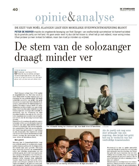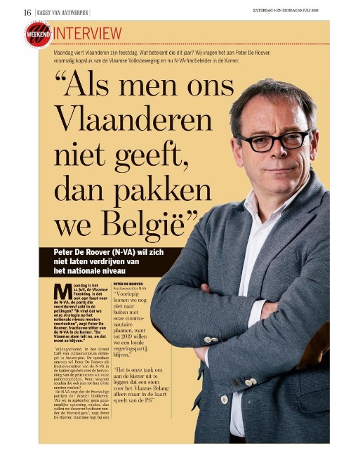 Maandag is het 11 juli, de Vlaamse Feestdag. Is dat ook een feest voor de N-VA, de partij die voortdurend zakt in de peilingen? “Ik vind dat we onze strategie op het nationale niveau moeten voortzetten”, zegt Peter De Roover, fractievoorzitter van de N-VA in de Kamer. “De Vlaamse stem telt nu, en dat moet zo blijven.”