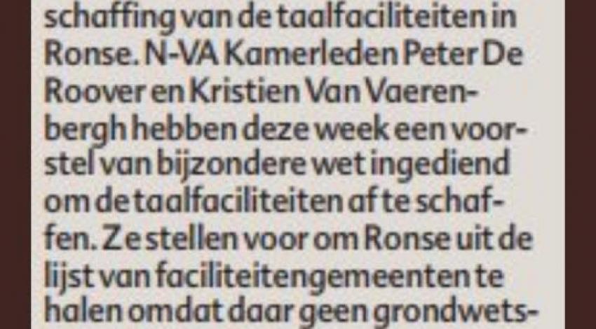 Niet onbelangrijk om te stellen dat de afschaffing van de taalfaciliteitenregeling geen afbreuk doet aan het grondwettelijk gewaarborgd recht op het vrij gebruik van de taal in privézaken. “Ronse stelt zich trouwens verder maximaal hoffelijk op ten aanzien van anderstaligen”, beklemtoont Van Vaerenbergh.