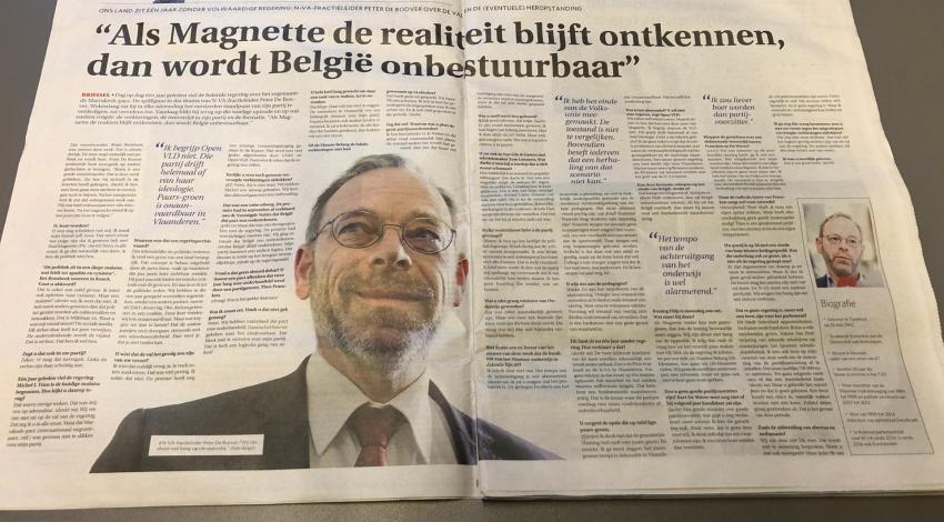 Zijn woordvoerder, Bram Bombeek, was nieuws deze week. Dat is uitzonderlijk. De man stopt namelijk met politiek en wordt boer. Peter De Roover probeerde hem tevergeefs op andere gedachten te brengen. “Bram is een goede woordvoerder. Dat is deze week gebleken. Zie hoe hij zichzelf in de kranten heeft gekregen. (lacht) Ik ben met hem gaan eten om hem te overtuigen toch te blijven. Na het voorgerecht wist ik dat dat onbegonnen werk was. Hij was héél enthousiast over zijn nieuwe leven. Na het nagerecht stond ik op het punt om hem te volgen.”