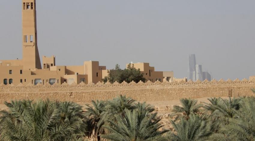 Foto: (c) Peter De Roover (Zicht op Riyad vanuit Diriyah, het stadje waarvan de koninklijke familie van de Saoeds afkomstig is. Ook in Saoedi-Arabië duikt op de achtergrond de moderne stad op.)