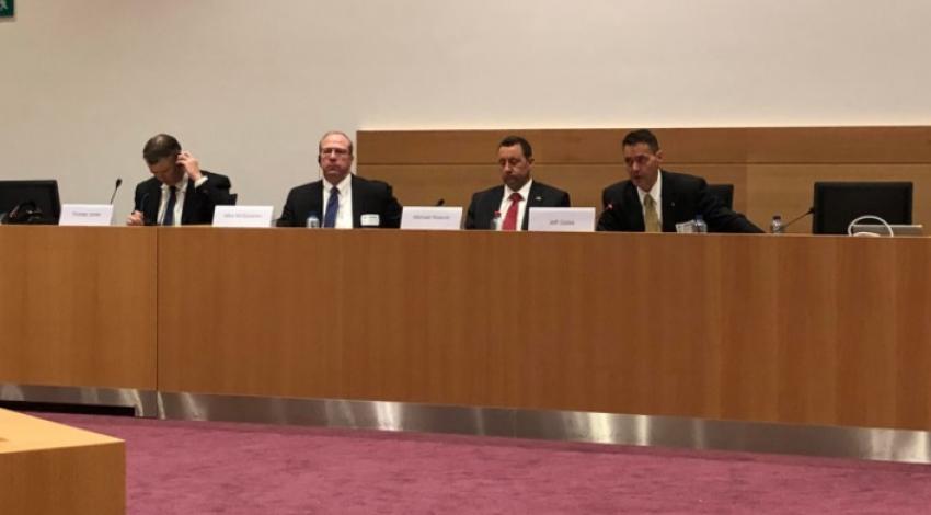 Foto: De Amerikaanse delegatie, hard best doende om niet naar de heup te grijpen.