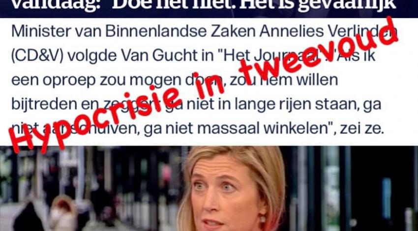Minister van binnenlandse zaken (!) Annelies Verlinden komt op het Journaal zeggen: “Als ik een oproep zou mogen doen, zou hem willen bijtreden en zeggen: ga niet in lange rijen staan, ga niet aanschuiven, ga niet massaal winkelen.” Ze voegt er zelfs hypocriet aan toe over de koopzondag: “De burgemeester van Antwerpen heeft dat toegelaten.” Jawel dat zegt ze letterlijk, terwijl zij het heeft toegelaten en de verantwoordelijkheid laf wegschuift.