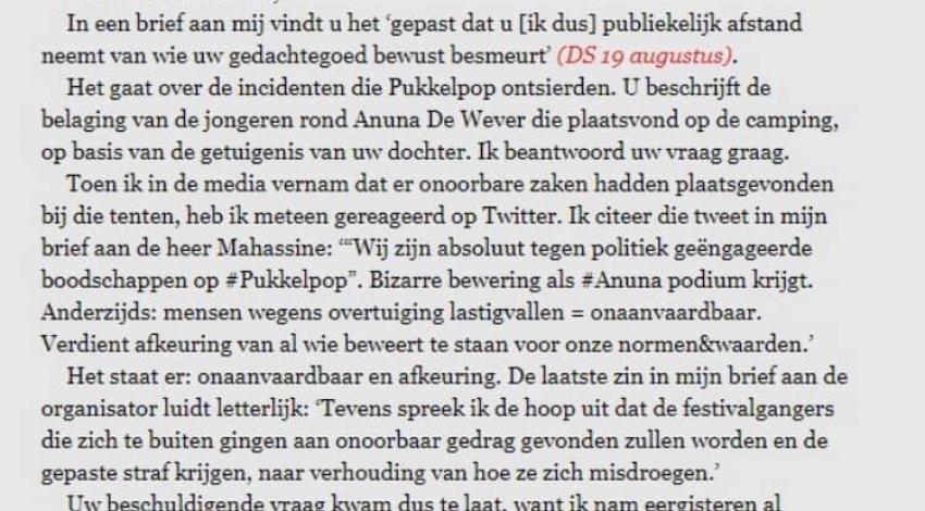 Politiek bedrijf je op basis van overtuigingen. Op vier punten kwam ik tussen in die Pukkelpopheisa en alle vier gaan ze volgens mij over essentiële elementen die ons samenleven betreffen.