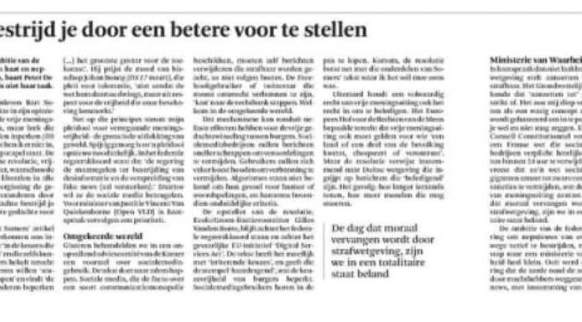 Is haatspraak dan niet laakbaar? Onze wetgeving stelt aanzetten tot haat strafbaar. Het Grondwettelijk Hof bakende dat ‘aanzetten tot’ gelukkig strikt af. Het zou mij diep verontrusten als een wazig concept als ‘haat’ wordt gehanteerd om in te perken wat je wel en niet mag zeggen. De Franse Conseil Constitutionnel vernietigde een Franse wet die socialemediabedrijven verplicht hatelijke berichten binnen 24 uur te verwijderen. Die vreest dat zo’n wet socialemediagiganten aanzet tot zware censuur om sancties te vermijden, wat de vrijheid van meningsuiting aantast. De dag dat moraal vervangen wordt door strafwetgeving, zijn we in een totalitaire staat beland.