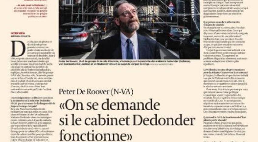 In het kantoor van De Roover sieren tientallen foto's en krantenartikelen de muur terwijl een kapstok beladen met stropdassen uitkijkt op een rommelig bureau. Op de salontafel prijkt een typemachine die uit het begin van de 20e eeuw lijkt te dateren. Een pagina steekt uit met "de eerste zin in het Nederlands", legt Peter De Roover, leider van de N-VA-fractie in de Kamer, uit. "Het werd gegraveerd in een boom gevonden." Het is heel oud Nederlands, maar hij vertaalt het voor ons: "Alle vogels zijn nesten begonnen, behalve ik en jij. Waar wachten wij nu op?" Een liefdesgedicht. Hebben we hier te maken met een romantische nationalist? Dat zullen we later moeten uitvinden. Nu tijd voor wat actualiteit.