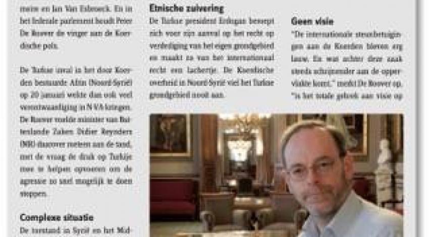 De Turkse inval in het door Koerden bestuurde Afrin (Noord-Syrië) op 20 januari wekte dan ook veel verontwaardiging in N-VA-kringen. De Roover voelde minister van Buitenlande Zaken Didier Reynders (MR) daarover meteen aan de tand, met de vraag de druk op Turkije mee te helpen opvoeren om de agressie zo snel mogelijk te doen stoppen.