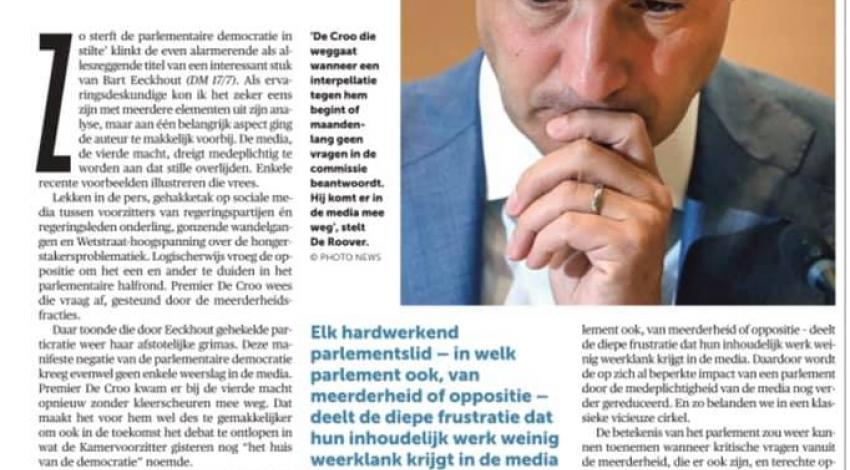 ‘Zo sterft de parlementaire democratie in stilte' klinkt de even alarmerende als alleszeggende titel van een interessant stuk van Bart Eeckhout (DM 17/7). Als ervaringsdeskundige kon ik het zeker eens zijn met meerdere elementen uit zijn analyse, maar aan één belangrijk aspect ging de auteur te makkelijk voorbij. De media, de vierde macht, dreigt medeplichtig te worden aan dat stille overlijden. Enkele recente voorbeelden illustreren die vrees.