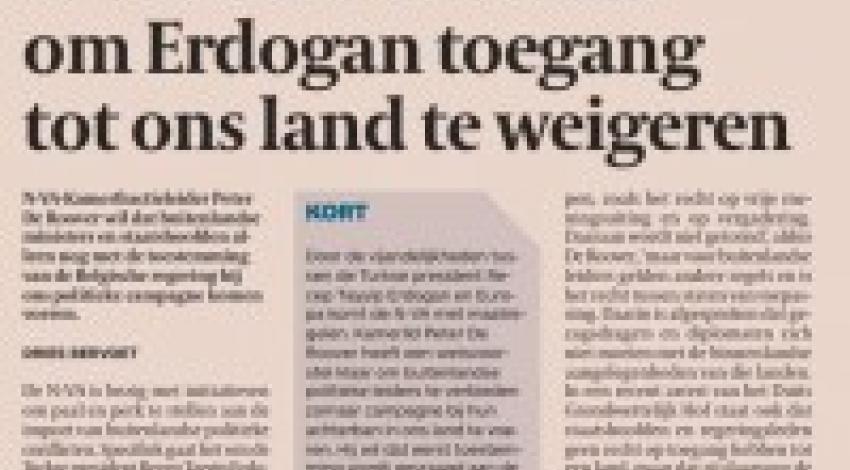 De N-VA is bezig met initiatieven om paal en perk te stellen aan de import van buitenlandse politieke conflicten. Specifiek gaat het om de Turkse president Recep Tayyip Erdogan die zonder schroom actief campagne voert bij West-Europese Turken - zoals twee jaar geleden voor 25.000 mensen in de Ethias Arena in Hasselt. Daarbij aarzelt hij niet om zijn aanhang tegen hun eigen overheden op te jutten. De zaak is actueel nu Erdogan op ramkoers zit met Nederland en Duitsland. Die wekten Erdogans toon op omdat ze niet wilden dat Turkse ministers verkiezingsmeetings op hun grondgebied zouden bijwonen.