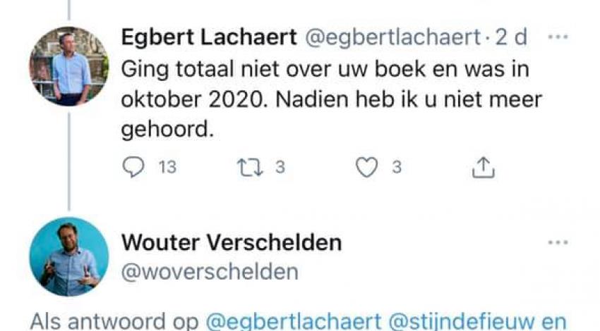 Boeiend was ook de twittercommunicatie tussen Egbert Lachaert (Open VLD) en Wouter Verschelden, Wetstraatjournalist én auteur van het veelbesproken ‘De doodgravers van België’. U kan ze hieronder lezen. Op de laatste tweet van Verschelden reageert de voorzitter van Open VLD niet meer…