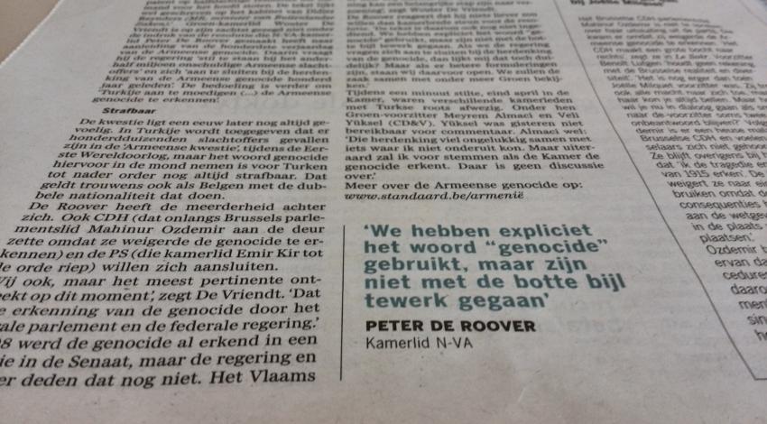 Ondertussen hebben de meerderheidspartijen een resolutie klaar om in het parlement de genocide te erkennen. Initiatiefnemer en NVA-Kamerlid Peter De Roover hoopt op kamerbrede steun.