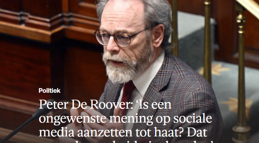 Peter De Roover: Dat gaat eerder over het bestraffen van aanzetten tot haat. Het is prima om haat te bestrijden, al is haat moeilijk te definiëren. De vraag is ook wie dat moet doen? Bovendien is haat op zich niet strafbaar, dus vind ik het bijzonder dat je gestraft kan worden voor het aanzetten tot iets wat niet strafbaar is. Wil je consequent zijn, maak dan van haat ook iets strafbaars. Dat is voor alle duidelijkheid niet wat ik vraag, maar het zou wel logischer zijn.