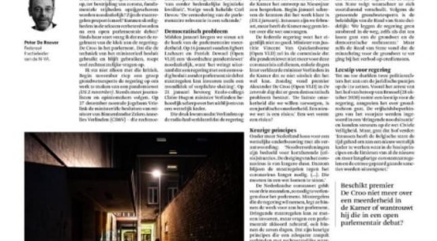 Half januari kregen we eindelijk expliciete steun uit parlementaire meerderheidshoek. Op 16 januari schreven Egbert Lachaert en Patrick Dewael een opiniestuk waarin ze een “doordachte pandemiewet” bepleitten, die “onze grondwettelijke vrijheden beschermt.” Ze schreven onder meer: “Maar het wringt uiteraard dat een regering met een eenvoudig besluit zonder parlementair debat maatregelen kan invoeren zoals een avondklok of verplichte sluiting. Een stevige wettelijke basis voor situaties als deze, ontworpen met het parlement, is daarom aangewezen.” Op 21 januari bevroeg Ecolo-collega Claire Hugon minister Verlinden behoorlijk scherp over het uitblijven van een wettelijk kader.