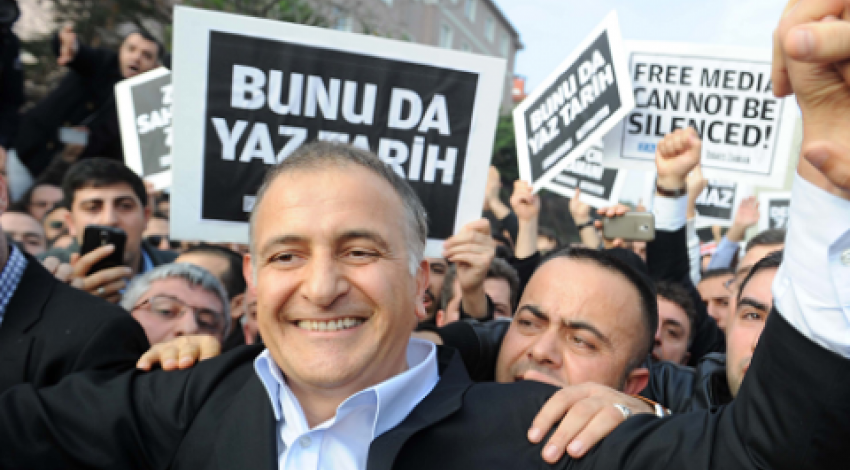 Foto: © ZamanVandaag: Aanhangers spreken hun steun uit voor hoofdredacteur Ekrem Dumanli bij zijn arrestatie.