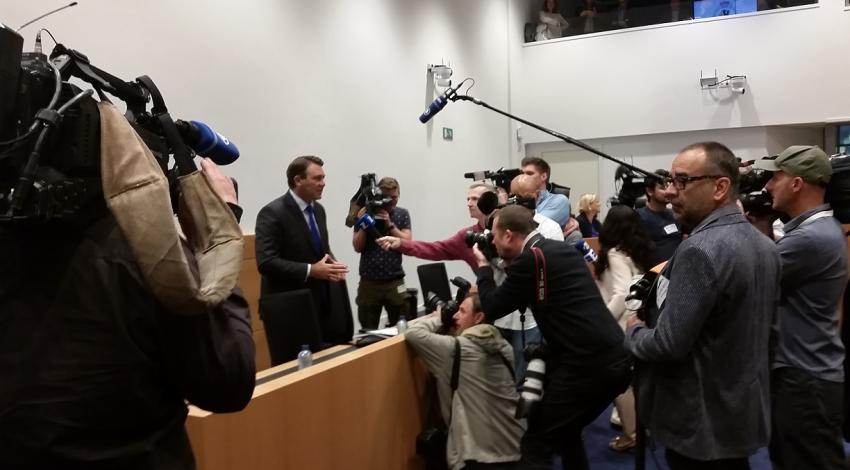 Foto: Voor de Kamercommissie van 9 augustus 2017 werd minister Ducarme door de pers letterlijk bestormd © Peter De Roover