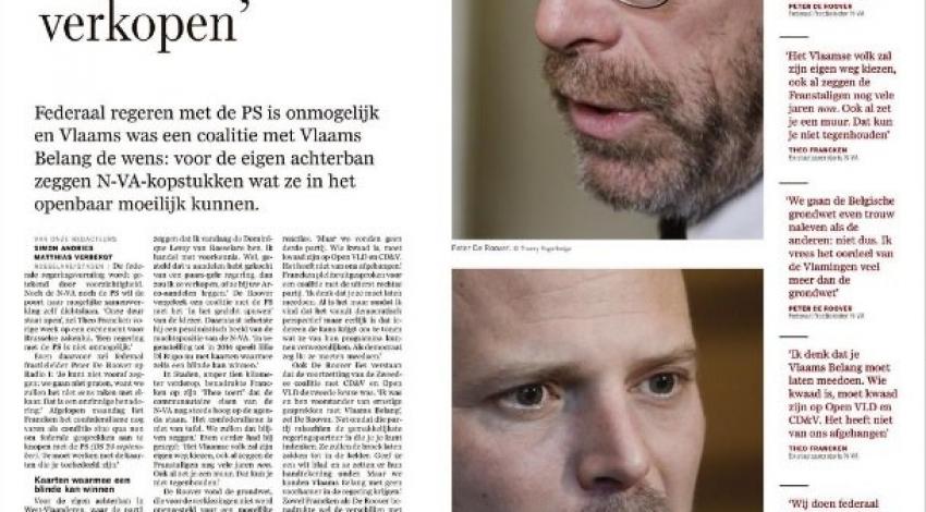 In die zin is de inleidende samenvatting in de krant erg kort door de bocht. Lees mee: "Federaal regeren met de PS is onmogelijk en Vlaams was een coalitie met Vlaams Belang de wens: voor de eigen achterban zeggen N-VA-kopstukken wat ze in het openbaar moeilijk kunnen."