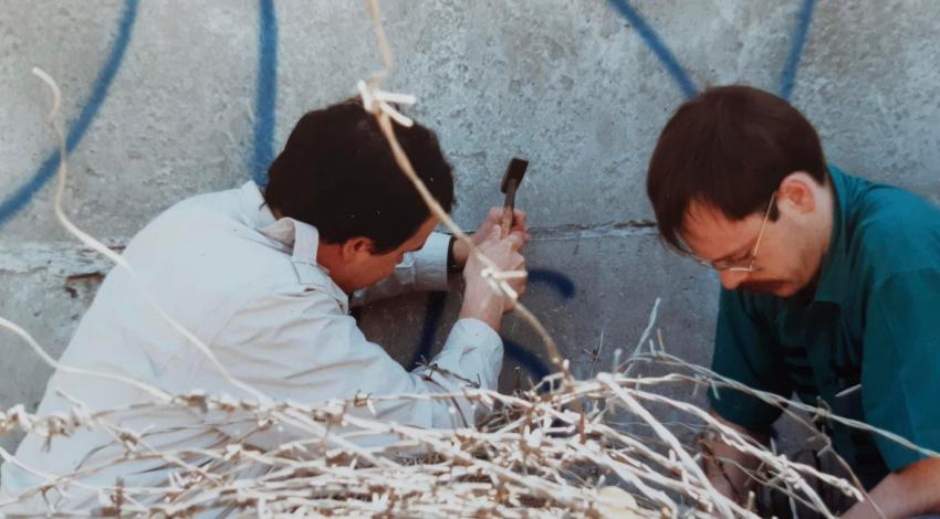 Die ene anekdote wring ik er toch even tussen want we - Koen, Raf en ik - schreven mee wereldgeschiedenis. Zonder ons was het wellicht ook gelukt maar wij waren toch maar mooi paraat in 1990 bij in het ontmantelen van de Berlijnse Muur. Het in elkaar stuikende communisme een neus zettend, vervingen we de sikkel door een beitel, reden oostwaarts en hamerden er lustig mee op los om de doorgang tussen West- en Oost-Berlijn te vergroten. Veertig centimeter prikkeldraad en een brokstuk Muur gingen mee als souvenir. We droegen als het ware ons steentje bij door er wat steentjes weg te halen.