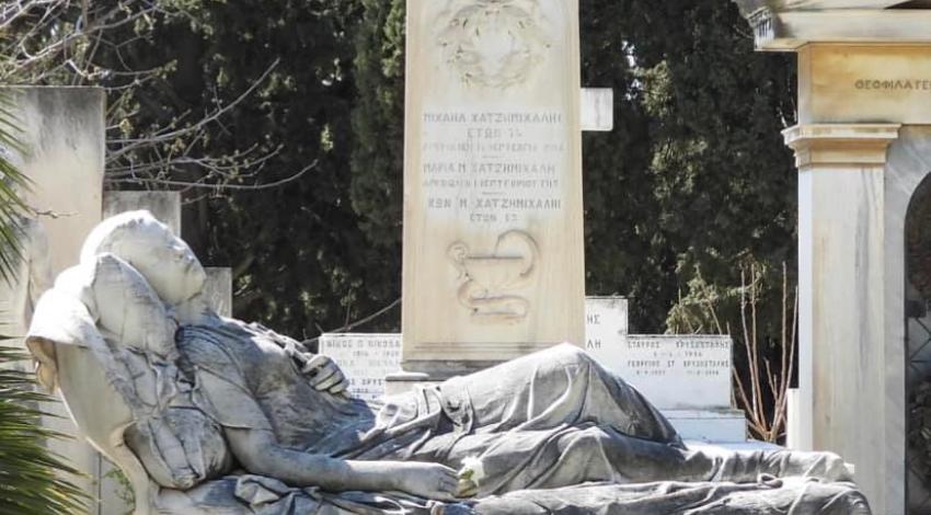 Ook Sofia Afentaki ligt hier begraven. Deze adembenemende schoonheid die, bewonderd en begeerd door elke Atheense jongeman met een minimum aan pit, de hele stad in tranen stortte door eind 1873 het onderspit te delven voor het tuberculosespook, ligt sedert 1878 onder een haar bijzondere maar al-bij-al vergankelijke bestaan een zekere eeuwigheidswaarde verlenend sculptuur van een Griekse beeldhouwer waarmee het ook niet goed is afgelopen. Tik Yannoulis Chalepas in uw google-balk en u verneemt er meer over. Je struikelt hier over de Griekse tragedies. Het beeld, een eerder slapend dan overleden meisje uitbeeldend, kan u hieronder op de foto bewonderen.