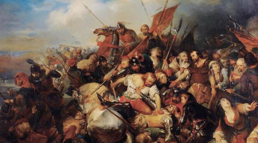(Foto: deze schilderij van Nicaise De Keyser - die van de Keyserlei -, ‘de slag der gulden sporen’, inspireerde Conscience. In 1944 werd het vernield. Een kleinere versie hangt nu, na restauratie in 2021, in de Kortrijkse Onze-Lieve-Vrouwenkerk.)