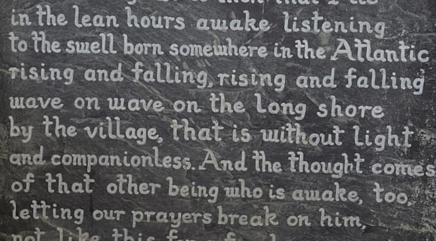 Het gedicht - en nu doe ik als erkende barbaar alsof je een gedicht kan vertellen - gaat over zo’n stille nacht waarin hij de uil in de verte hoort, en de blaffende vos. In de vroege uurtjes hoort hij hoe de golven, rijzend en dalend, de kust bespoelen van het vergeten dorp waar alle lichten zijn gedoofd. Dan bevangt hem de gedachte aan die andere die ergens wakker ligt, hun gebeden gezamenlijk niet slechts even, enkele uren, dagen of jaren maar eeuwig tot Hem gericht.
