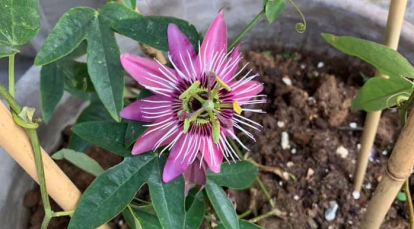 Voor onze deur bloeit de passieflora. Paarsgroen zowaar maar toch heerlijk om naar te kijken, wat ik bij vertrek thuis ook elke keer doe. Iedereen die passeert, heeft de volle vrijheid er van te genieten. U nu ook.