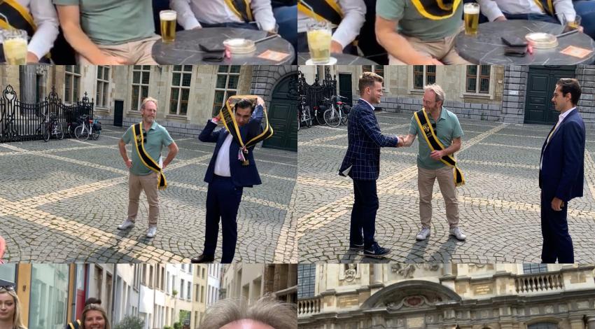 Boodschappen afzetten en Conscienceplaatswaarts want ik word vandaag weer Peter, in het kwadraat want een spiksplinternieuw lint bevestigt dat mij de eer te beurt valt de Antwerpse N-VA-studentenclub Jong N-VA StuAnt te mogen bepeteren. Eigenlijk Peter tot de vierde macht want ooit werd Cisse mijn studentenpetekind, neef Dries mijn echte. Maar die bevorderingen liggen ruim drie decennia in het verleden. Nu komt daar, na de doop van de lintfrennels in het bier (dopen dus), een hele bende petekinderen bij.