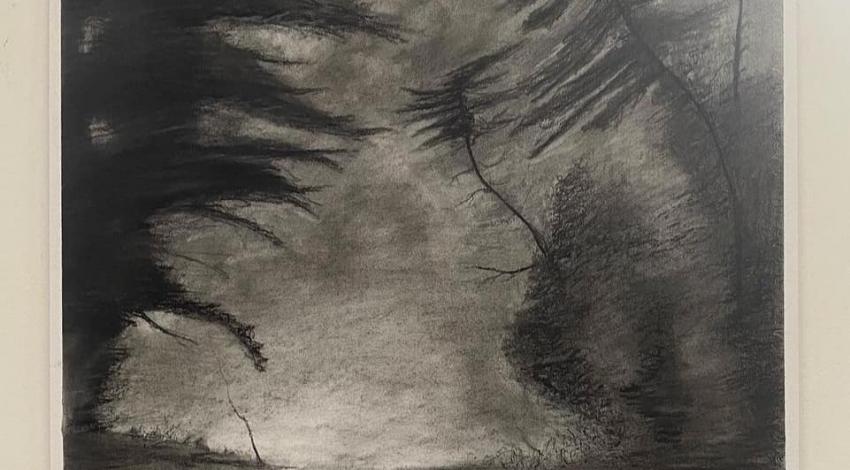 (Foto: Een houtskoolwerk van zoonlief wiens tentoonstelling in de Wolstraat 34 volgend weekeinde wordt afgesloten. Het werk kreeg de passende en alleszeggende titel ‘Man in boot met roeispaan op een rivier tussen de bomen in een mistig landschap op een dinsdagochtend, ofzo’. Op weg naar de eeuwigheid misschien.)