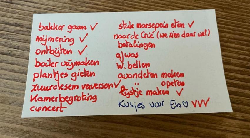 Bij het krieken van de dag noteren wat tegen de avond toch echt wel afgewerkt hoort te zijn, biedt welkom houvast en het genot telkens wanneer achter een opdracht een vinkje wordt gezet, vloeit voort uit de dan visueel vaststelbaar geboekte vooruitgang - al komt die dikwijls eerder neer op het stelpen of zelfs slechts vertragen van achteruitgang, verwording, entropie maar daarover spreekt dergelijk lijstje zich gelukkig niet uit