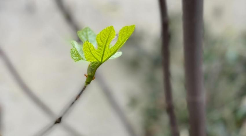 Foto: Zie hoe het vijgenblad, die aankondiger van de lente, in ons tuintje ontluikt.