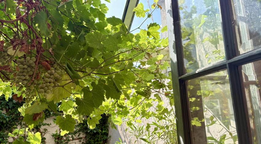 (Foto: Een prent van een vuilniszak zou deze tekst weinig sieren. Dan maar een van de druivelaar boven onze achterdeur die onder het gewicht van de wassende trossen naar beneden zakte en zo het zicht dominerend de indruk wekt dat zich achter onze keuken de tuin van eden uitstrekt.)